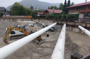 In der vergangenen Woche wurde die provisorische Umverlegung der Abwasserleitung auf der Nordwestseite (Aignerweg bis Seestraße) abgeschlossen. Die Pumpen werden ab sofort für die Dauer der Herstellung der Mixed in Place Wände in Betrieb genommen. Wir gehen von ca. drei Wochen aus. Es sind kaum Geräuschemissionen zu erwarten. Außerdem wurde an der Nordwestseite der Bauzaun auf drei Meter erhöht und eine Fotoplane angebracht.