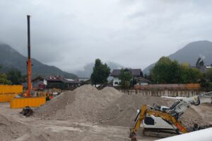 In der kommenden Woche werden weiter die überschüssigen Massen aus der Baugrube abgefahren. Um diese Arbeiten möglich rasch zu beenden, befinden sich hierfür 15 LKW im Umlauf, die nun durch den Einweiser möglichst ohne Verkehrsbehinderungen gesteuert werden.