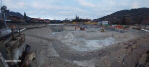 Ab dem 07.01.2026 wird zunächst die Schutzschicht (ca. 20 cm), die das Planum vor Regen, Frost und Schnee schützt, mittels Bagger abgetragen und verladen. Im Anschluss erfolgt der Aushub der Tiefteile sowie die Herstellung der Grundleitung in enger Abstimmung mit dem Rohbauer.