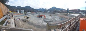 In der kommenden Woche werden weiter die überschüssigen Massen aus der Baugrube abgefahren. Um diese Arbeiten möglich rasch zu beenden, befinden sich hierfür 15 LKW im Umlauf, die nun durch den Einweiser möglichst ohne Verkehrsbehinderungen gesteuert werden.